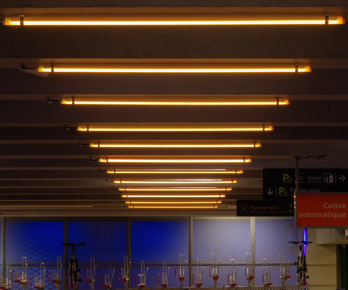 La circulation des vélos dans la vélo-station du Hall Pasteur est facilitée par une centaine de tubulaires à LED ACTiLED, de couleur bleu et cuivre. Ces tubulaires ACTiTube40SRGBW ont été sélectionnés pour leur aspect fonctionnel et leur éclairage dynamique offrant la possibilité de paramétrer des scénarios de couleur au gré des envies. ACTiLED Lighting a réalisé sur site la livraison du matériel de pilotage DALI et s'est chargé de la programmation et configuration sur site des appareils.
