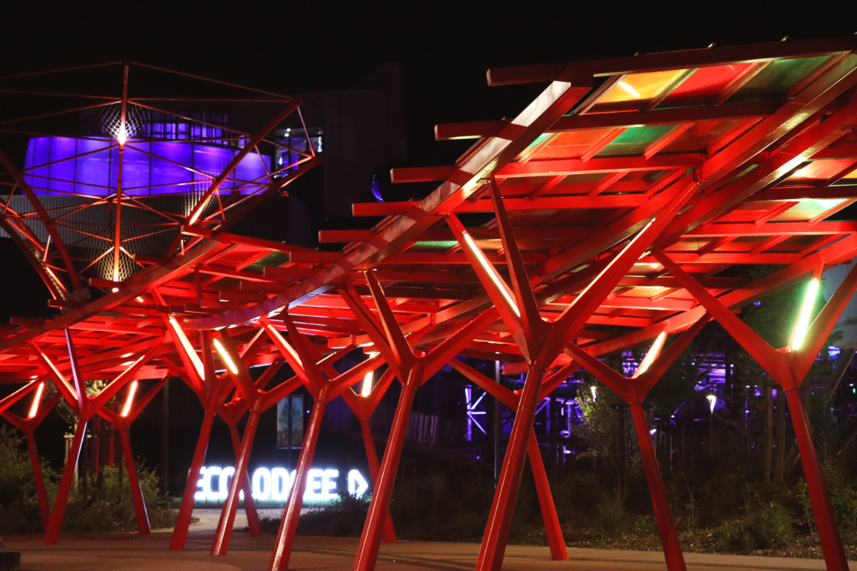 Quelques références de projets d'éclairage extérieur : Éclairage passerelle, Main courante escaliers, éclairage cour d'école, retrofit éclairage public, éclairage Parc La Villette, éclairage Plazza Futuroscope...