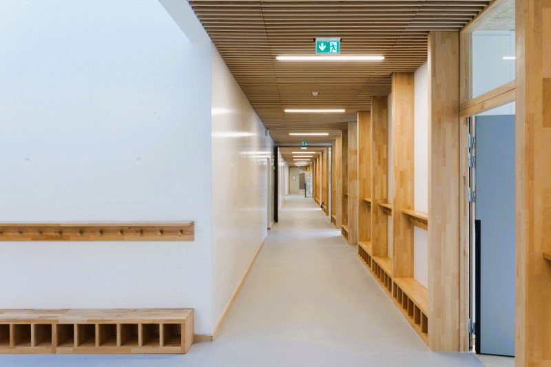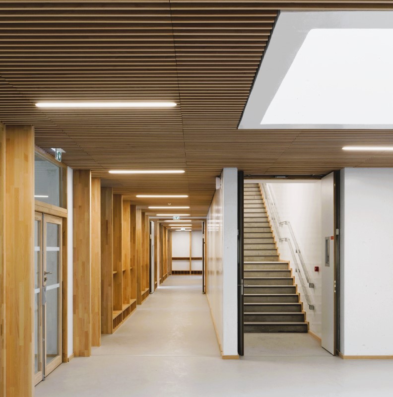 Une centaine de luminaires ACTiLine4310 ont été installés en applique dans les circulations du groupe scolaire: couloirs, salle de travail, hall d'accueil...Cet éclairage linéaire compact et discret est intégré entre les lames à bois d'un plafond acoustique Laudescher. Il éclaire en intérieur divers espaces du bâtiment à énergie positive qui se distingue par son excellence environnementale : l'école produit davantage d’énergie qu’elle n’en utilise.