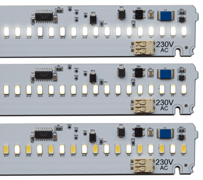 Les modules ACTiLED adoptent une technique différente : ils sont alimentés directement en 230VAC et intègrent un driver qui alimente les LED organisées par zones par un principe d’alimentation séquentielle.